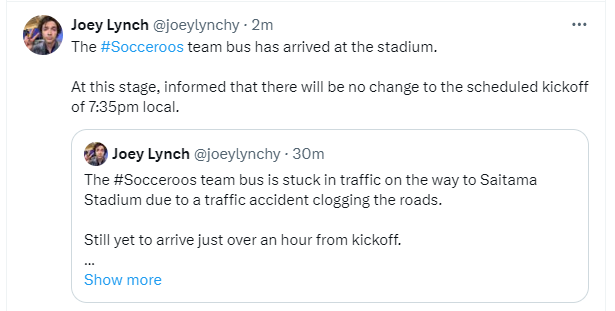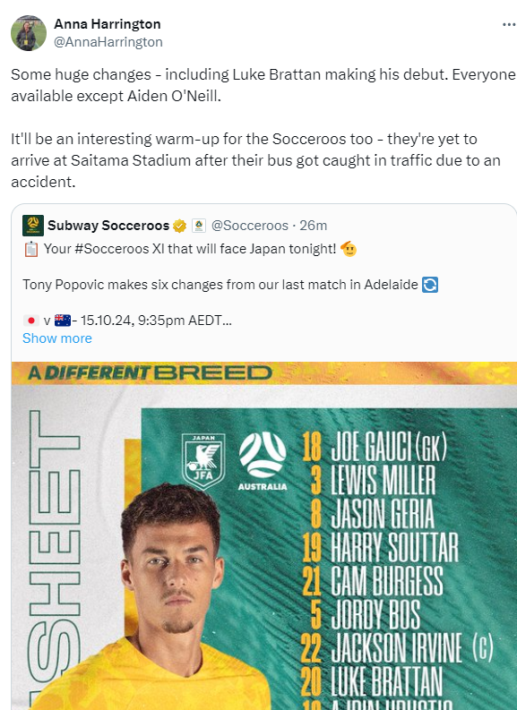 澳大利亚体育记者安娜·海林顿报道,由于澳大利亚队的大巴在前往琦玉体育场的路上卷入了一起交通事故,大巴遭遇了严重的堵车,球队目前还没有抵达球场,预计热身和踩场的时间可能会稍微缩短。