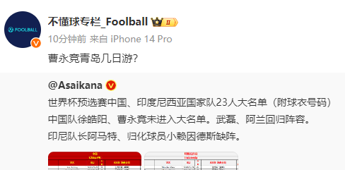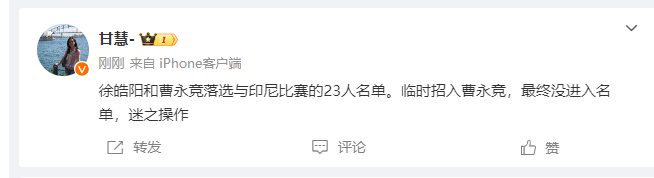 记者兼媒体人甘慧发文吐槽道:“徐皓阳和曹永竞落选与印尼比赛的23人名单。临时招入曹永竞,最终没进入名单,迷之操作 。”