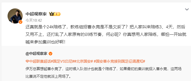 博主“中超观察家”则觉得伊万纯粹把曹永竞当做“工具人”使用:“还真就是个24k陪练了,教练组招曹永竞是不是欠妥了?把人家叫来陪练3、4天,然后又用不上,还打乱了人家原有的训练节奏,何必呢?你真想用人家陪练,哪怕一开始就喊来参加集训也好啊!”