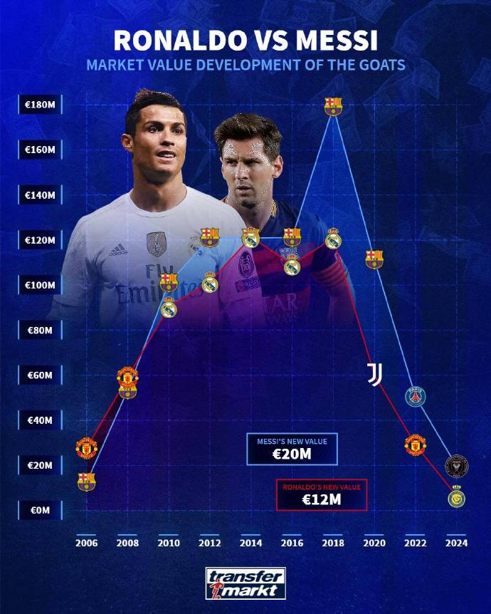 雷速体育12月16日讯 德转整理了一份梅西和C罗职业生涯的身价走势图。