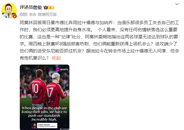雷速体育12月17日讯 本轮英超曼市德比,拉什福德和加纳乔未进入大名单引发热议,媒体人詹俊社媒发文表示拉什福德与加纳乔不因伤病落选,这其实也是一种“纪律”处分。