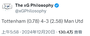 数据显示热刺预期进球数0.78却打进了4球,而曼联预期进球数2.58是对手的三倍多,最终打进3球。