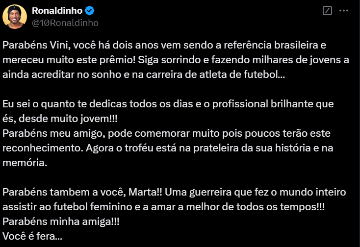 小罗对维尼修斯进行了祝贺:“我要恭喜维尼修斯,在过去的两年时间里,你一直代表着巴西足球的最高水准,获得这个奖项实至名归。请你继续保持微笑,继续激励成千上万的年轻球员勇敢追梦。”
