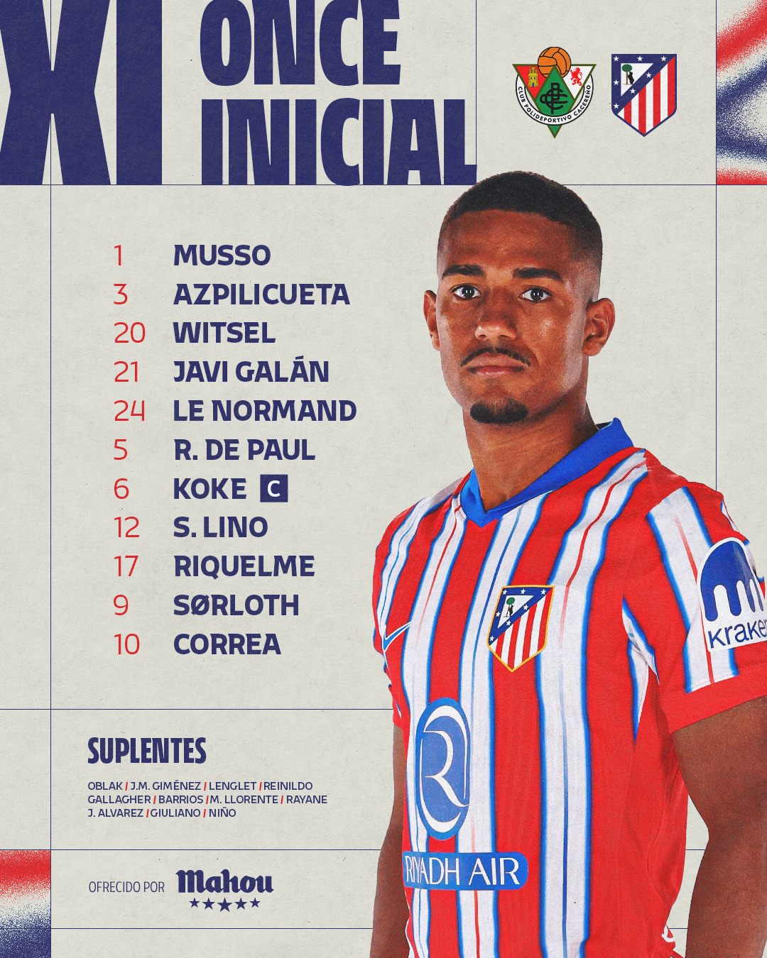 马德里竞技首发:1-穆索、3-阿兹皮利奎塔、20-维特塞尔、21-加兰、24-勒诺尔芒、5-德保罗、6-科克、12-利诺、17-里克尔梅、9-索尔洛特、10-科雷亚