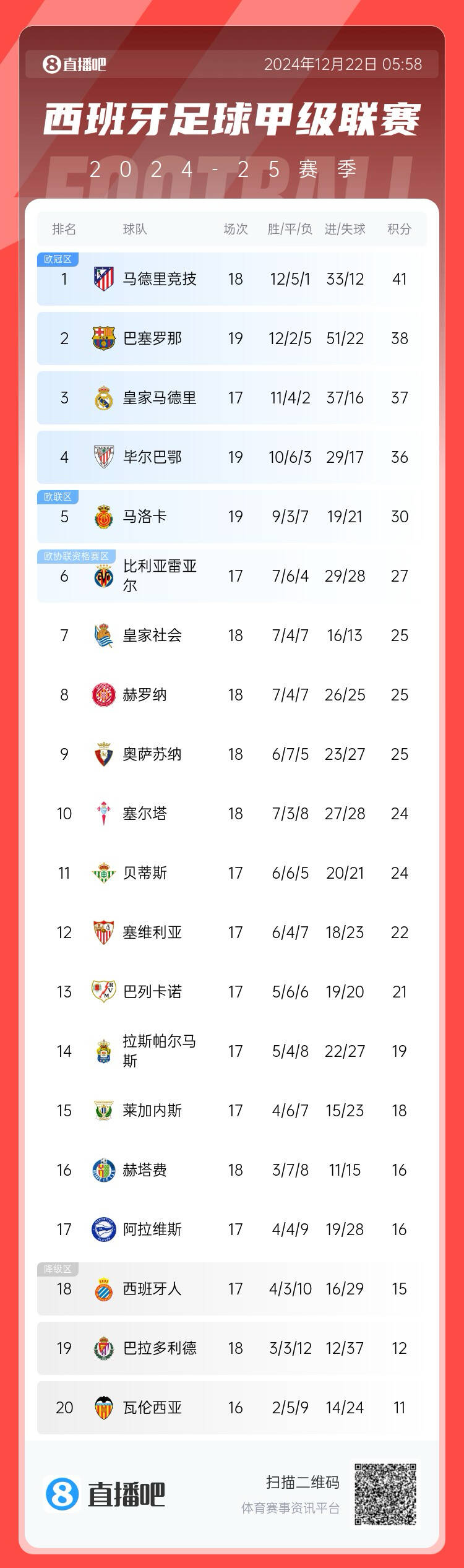 在当前的积分榜上,马竞18轮战罢积41分排第1,巴萨则是19轮战罢积38分落后马竞3分,而皇马打完17轮暂时落后马竞4分。目前这3家球会最大相差4分(需要注意场次不一),在还剩半个赛季的情况下,一切均有变数。