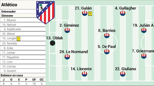 中场:巴里奥斯、德保罗、加拉格尔、朱莉诺·西蒙尼