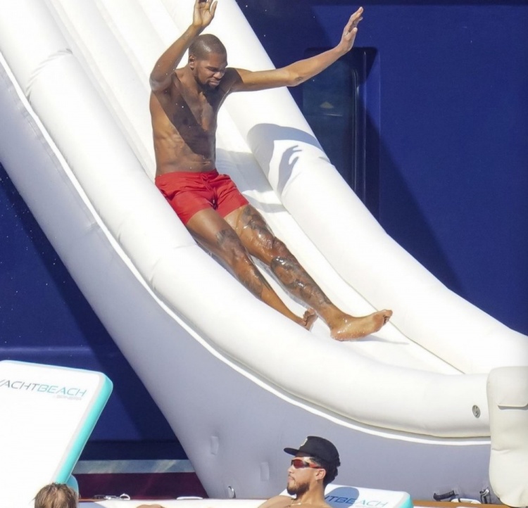 “哦,他们在错误的时间偷拍到了我……我当时是双手扶着滑梯上方的横杆,然后就那么的滑下来了……那是个很好玩的滑梯,不过后来我看到在网上火了之后,我第一时间想的是,谁TM的在大海中间还能用长镜头偷拍到这种照片啊?不过我给这个摄影师Respect。”杜兰特说道。